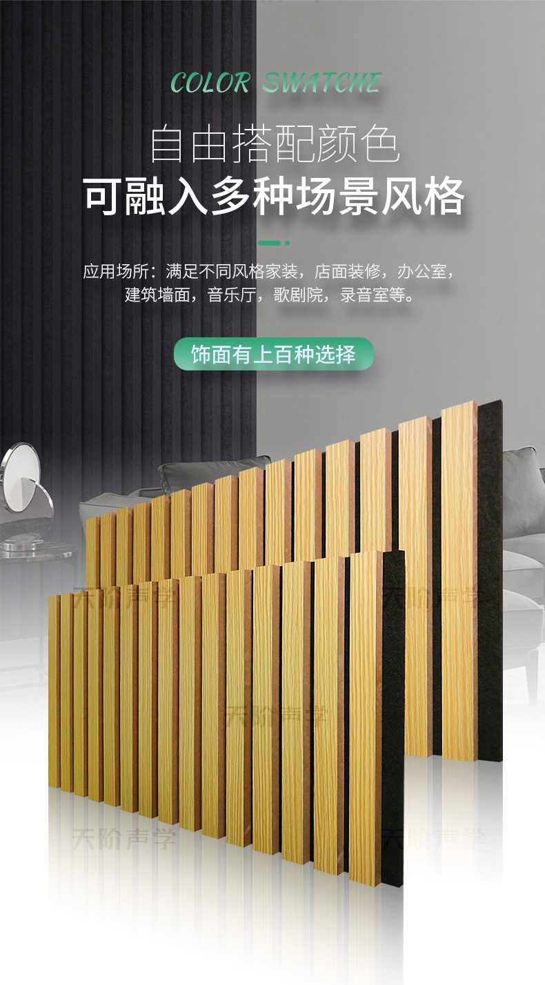 適用于多種場所:多種飾面,滿足不同風格家裝,店面裝修,辦公室,建筑墻面,廣告牌制作,音樂廳,歌劇院,錄音室等(內外墻,室內天花)。